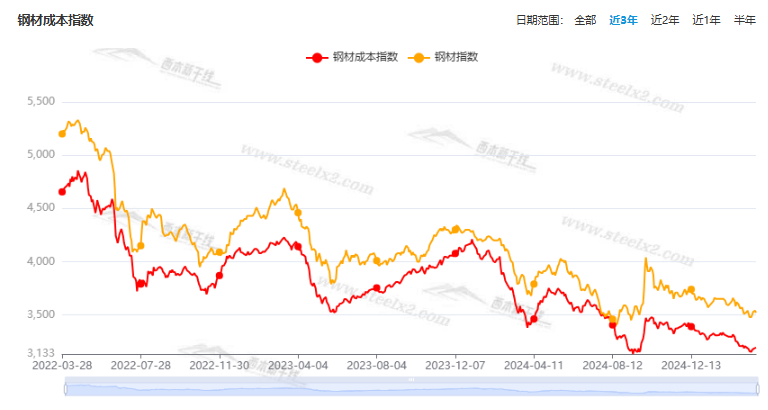 本期,全国各地市场建筑钢材价格震荡趋高:其中,北方钢厂托举,小幅整理;南方期现同步,低位波动。本周西本钢材指数小涨,成本指数上移,显示长流程钢厂利润空间变化不大;本周螺纹钢期货主力合约低位震荡,对现货市场有示范作用。(下图为红色线条为钢材指数,黄色线条为成本指数)