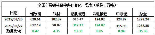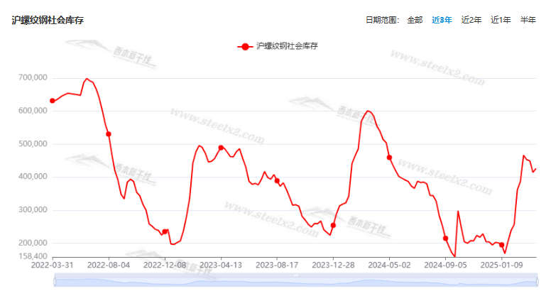 据西本资讯历史数据,当前库存总量较上年同期(2024328日的1679.37万吨)减少416.99万吨,降幅24.83%。分品种看,本期五大钢材品种库存中,所有品种库存继续回落。(见下图)