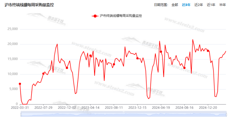 本期,西本资讯监测的沪市线螺周终端采购量为1.77万吨,周环比增加5.36%(见下图)。本周,终端需求环比继续回升,表明晴好天气利于施工