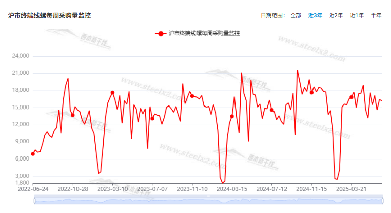 本期,西本资讯监测的沪市线螺周终端采购量为1.62万吨,周环比减少1.22%(见下图)。本周终端需求环比变化不大,显示需求整体处于淡季。