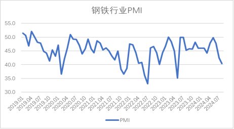 从中物联钢铁物流专业委员会调查、发布的钢铁行业pmi来看,2024年8月份为40.4%,环比下降2.1个百分点,显示钢铁行业继续走弱。分项指数变化显示,钢铁行业淡季特征仍较明显,市场需求下行有所持续,钢铁生产有所缩减,钢厂库存继续增加,原材料价格低位运行,钢材价格触底反弹。预计9月份,在需求旺季预期带动下,市场需求有所回升,钢铁生产小幅增长,原材料和钢材价格均有上升。