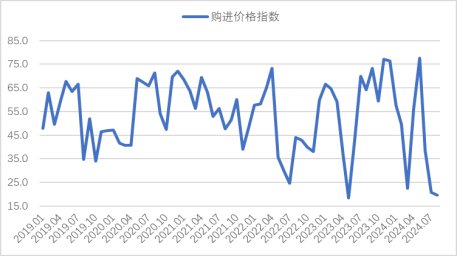 采购端再度下滑,原料价格低位运行。8月份,随着生产端缩减,原材料采购也呈现较为明显的下滑,采购量指数为40.6%,较上月下降7.4个百分点,降至较低水平。采购端下滑使得原材料价格继续承压走弱。购进价格指数为19.6%,较上月下降1.2个百分点,连续2个月位于20%左右的低位。分品类来看,铁矿石市场经历了前期加速下行态势后,价格下降速度趋缓。焦炭市场在经历了多轮提降落地后,价格有明显下降。废钢市场也持续走低,在失去反向开票的支撑后,甚至出现了加速补跌现象。