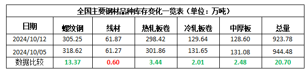 据西本资讯历史数据,当前库存总量较上年同期(2023年10月12日的1120.23万吨)减少196.45万吨,降幅为17.54%。分品种看,本期五大钢材品种库存中,除线盘外,其它品种库存环比下降。(见下图)