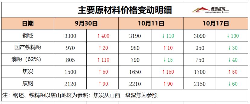 本周国内主要原料多数下跌,其中,进口矿价弱势下跌,钢坯行情大幅暴跌,国产矿小幅见跌,焦炭六轮提涨落地,废钢市场先扬后抑,分品种来看: