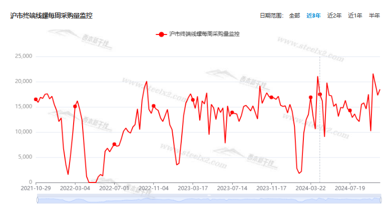 本期,西本资讯监测的沪市线螺周终端采购量为1.85万吨,周环比增加6.94%(见下图)。本周,终端需求环比回升,显示价格下跌后工地增加补货。