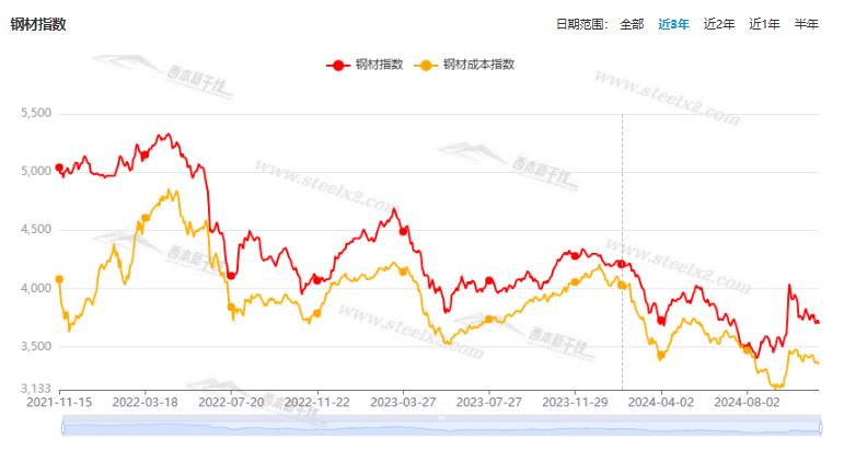 本期,全国各地市场建筑钢材价格整体下移:其中,北方需求减弱,补跌幅度加大;南方期现同步,震荡走弱。本周西本钢材指数下调,成本指数调低,显示长流程钢厂利润空间变化不大;本周螺纹钢期货主力合约波动收低,对现货市场有示范效应。(下图为红色线条为钢材指数,黄色线条为成本指数)