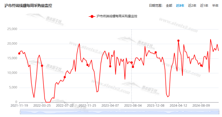 本期,西本资讯监测的沪市线螺周终端采购量为1.76万吨,周环比减少11.56%(见下图)。本周,终端需求环比回落,主要是因为价格走低,工地消极进货。