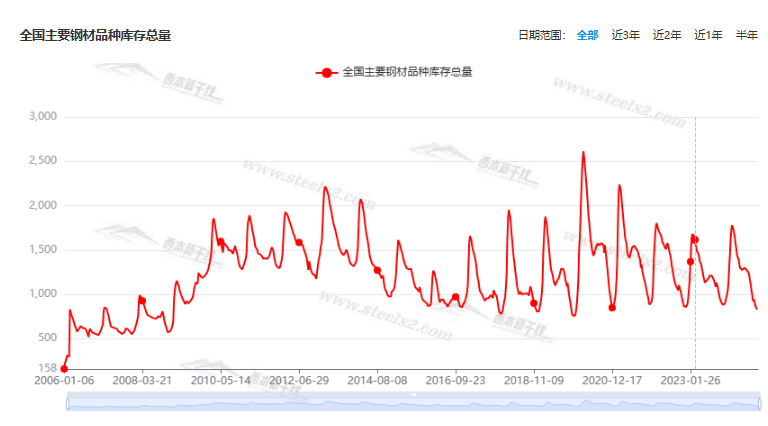 本期,全国35个主要市场样本仓库钢材总库存量为822.06万吨,周环比减少7.98万吨,降幅为0.96%。主要钢材品种中,螺纹钢库存量为299.08万吨,环比增加7.60万吨,增幅为2.61%;线盘库存量为46.86万吨,周环比增加2.35万吨,增幅为5.28%;热轧卷板库存量为244.13万吨,周环比减少10.79万吨,降幅为4.23%;中厚板库存量为118.17万吨,周环比减少1.86万吨,降幅为1.55%;冷卷板库存量为113.82万吨,周环比减少5.28万吨,降幅为4.43%。