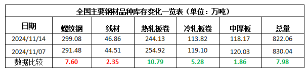 据西本资讯历史数据,当前库存总量较上年同期(2023年11月16日的933.23万吨)减少111.17万吨,降幅为11.91%。分品种看,本期五大钢材品种库存中,除了螺纹钢和线材外,其它品种库存环比下降。(见下图)