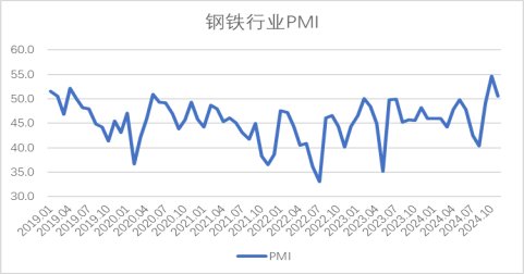 从中物联钢铁物流专业委员会调查、发布的钢铁行业pmi来看,2024年11月份为50.6%,环比下降4个百分点,结束连续2个月环比上升态势,但指数仍保持在扩张区间,显示在旺季过后,钢铁行业增速有所放缓,但在上月基础上仍保持整体稳中略增态势。分项指数变化显示,钢市需求增速有所回落,钢厂生产增速高位放缓,原料价格整体回落,钢材价格震荡下行。预计12月份,市场需求趋于收缩,钢铁生产有所放缓,原材料价格继续下滑,钢材价格低位震荡。