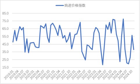 原料价格整体回落,具体品种明显分化。11月份,尽管钢厂生产继续扩张带动原材料采购保持增长,但由于需求淡季预期影响,原材料价格整体有所回落。购进价格指数为38.1%,较上月下降18.4个百分点。分品类来看,价格走势分化较为明显。铁矿石在炒作因素下波动上涨。焦炭市场11月份经历了三次提降落地,价格明显下降。成材价格回落以及电炉炼钢利润收窄对废钢的支撑力度有所减弱,废钢价格也有所回落。整体来看,11月原材料价格呈现下行态势。