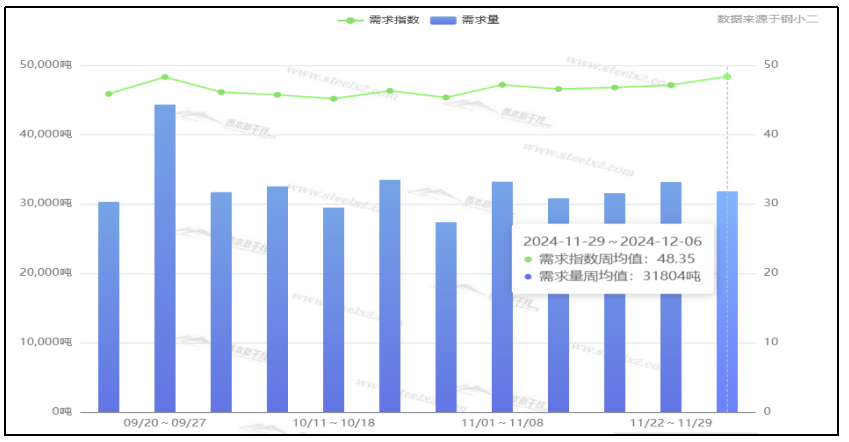 从终端需求来看,据钢小二平台周均值数据显示,12月6日全国工程需求量周均值为31804吨,环比周均值下降4.05%。其中,上海周均值14463吨,环比周均值下降;广州4895吨,环比周均值下降;杭州4345吨,环比周均值下降。工程需求pmi为48,需求略差。