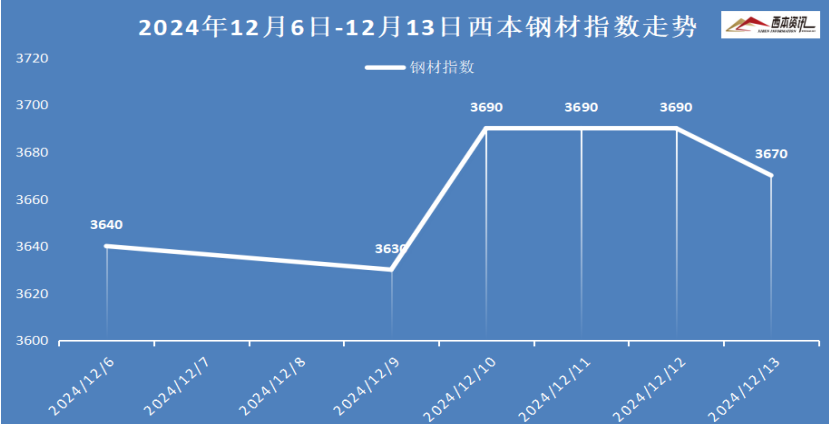 本周国内建筑钢材小幅上涨,截至12月13日,西本指数报在3670,周环比上涨30。