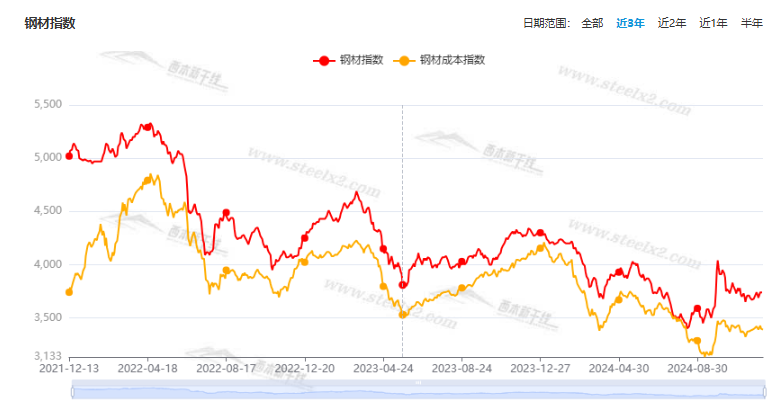 本期,全国各地市场建筑钢材价格波动上移:其中,北方钢厂强势,市场拉升;南方期货引领,涨后调整。本周西本钢材指数趋高,成本指数盘整,显示长流程钢厂利润空间略有改善;本周螺纹钢期货主力合约区间起伏,对现货市场有带动作用。(下图为红色线条为钢材指数,黄色线条为成本指数)