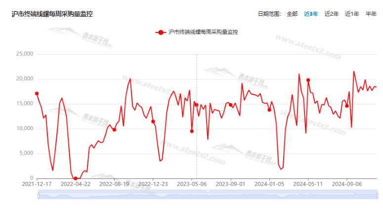 本期,西本资讯监测的沪市线螺周终端采购量为1.84万吨,周环比减少0.54%(见下图)。本周,终端需求环比变化不大。
