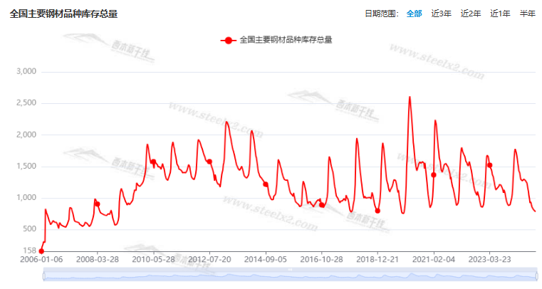 本期,全国35个主要市场样本仓库钢材总库存量为785.79万吨,周环比减少7.23万吨,降幅为0.91%。主要钢材品种中,螺纹钢库存量为296.82万吨,环比减少7.96万吨,降幅为2.61%;线盘库存量为42.47万吨,周环比增加0.35万吨,降幅为2.93%;热轧卷板库存量为228.89万吨,周环比减少0.07万吨,增幅为0.83%;中厚板库存量为111.56万吨,周环比增加0.88万吨,增幅为0.80%;冷卷板库存量为104.37万吨,周环比减少2.18万吨,降幅为2.15%。