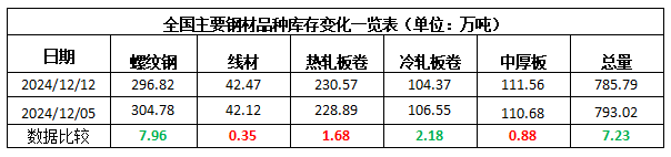 据西本资讯历史数据,当前库存总量较上年同期(2023年12月14日的876.86万吨)减少91.07万吨,降幅为10.39%。分品种看,本期五大钢材品种库存中,螺纹和冷轧卷板库存环比下降,其它库存小幅回升。(见下图)