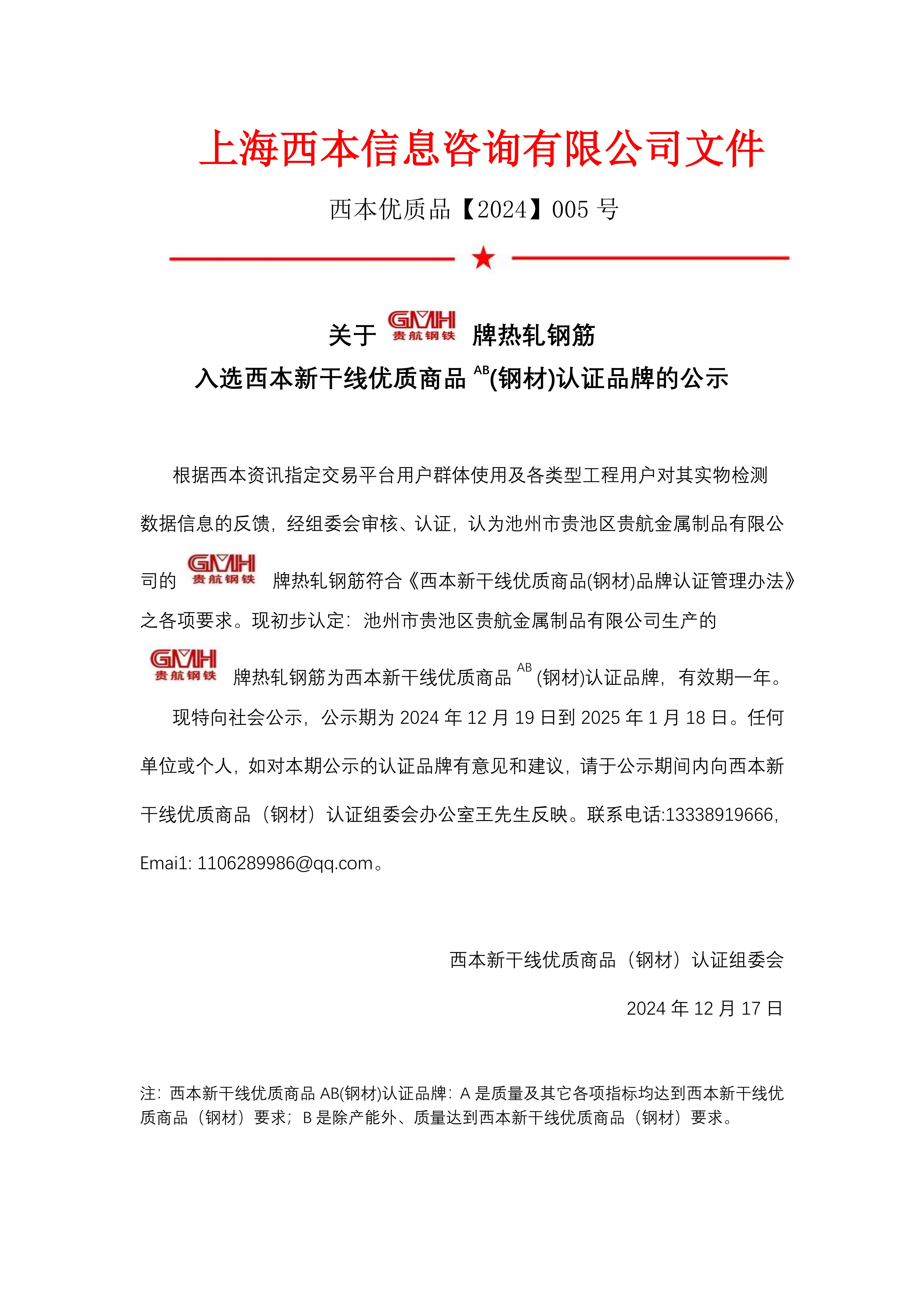 关于“贵航钢铁”牌热轧钢筋入选西本新干线优质商品(钢材)认证品牌的公示