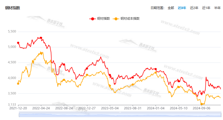 本期,全国各地市场建筑钢材价格震荡偏弱:其中,北方局部走低,钢厂跟进;南方期现同步,波动下移。本周西本钢材指数下调,成本指数回落,显示长流程钢厂利润空间仍未拓展;本周螺纹钢期货主力合约重心向下,对现货市场有抑制作用。(下图为红色线条为钢材指数,黄色线条为成本指数)