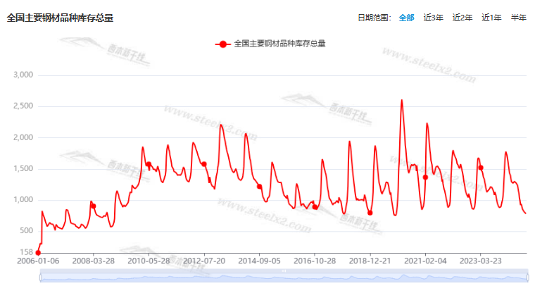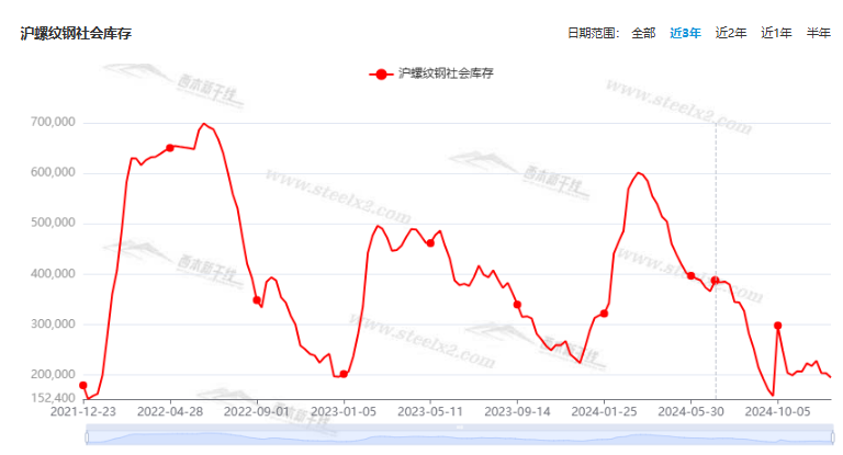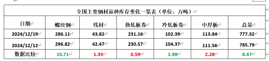 据西本资讯历史数据,当前库存总量较上年同期(2023年12月21日的873.97万吨)减少96.65万吨,降幅为11.06%。分品种看,本期五大钢材品种库存中,螺纹和冷轧卷板库存环比下降,其它库存小幅回升。(见下图)