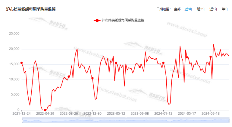 本期,西本资讯监测的沪市线螺周终端采购量为1.78万吨,周环比减少3.26%(见下图)。本周,终端需求环比小幅回落。