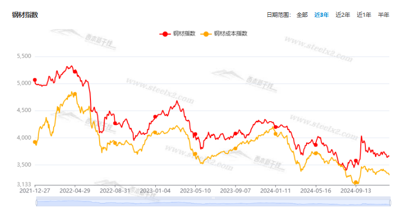 本期,全国各地市场建筑钢材价格小幅波动:其中,北方钢厂挺价,市场抗跌;南方情绪扰动,小幅起落。本周西本钢材指数趋高,成本指数调低,显示长流程钢厂利润空间略有改善;本周螺纹钢期货主力合约低位波动,对现货市场有示范作用。(下图为红色线条为钢材指数,黄色线条为成本指数)