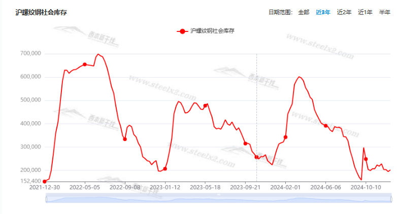 据中国钢铁工业协会统计数据显示,2024年12月中旬重点钢企生铁日均产量181.3万吨,旬环比下降1.6%,同比上升2.5%;粗钢日均产量197.7万吨,旬环比下降2.3%,同比下降0.1%;钢材日均产量196.8万吨,旬环比上升2.1%,同比上升0.3%。12月中旬重点钢铁企业钢材库存量为1464万吨,旬环比增加46万吨,上升3.2%;比上月同旬减少91万吨,下降5.9%;比去年同旬减少38万吨,下降2.5%。