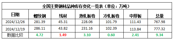据西本资讯历史数据,当前库存总量较上年同期(2023年12月28日的894.85万吨)减少126.87万吨,降幅为14.18%。分品种看,本期五大钢材品种库存中,线盘库存环比回升,其它库存回落。(见下图)