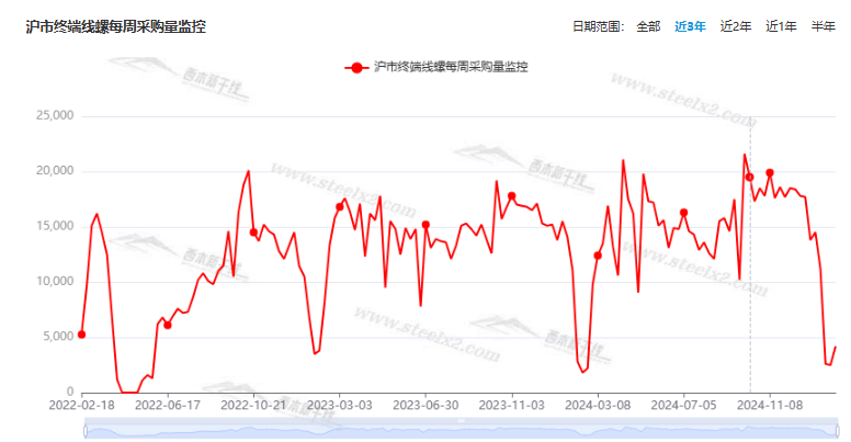 本期,西本资讯监测的沪市线螺周终端采购量为0.42万吨,周环比增加68%(见下图)。本周,终端需求环比提升,主要原因是工地陆续复工,但增长势头不猛。