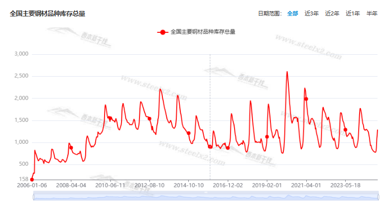 本期,全国35个主要市场样本仓库钢材总库存量为1290.50万吨,周环比增加131.25万吨,增幅为11.32%。主要钢材品种中,螺纹钢库存量为584.62万吨,环比增加96.01万吨,增幅为19.65%;线盘库存量为95.34万吨,周环比增加11.28万吨,增幅为13.42%;热轧卷板库存量为339.09万吨,周环比增加20.29万吨,增幅为6.36%;中厚板库存量为141.83万吨,周环比减少0.41万吨,降幅为0.29%;冷卷板库存量为129.62万吨,周环比增加4.08万吨,增幅为3.25%。