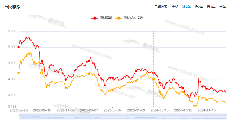 本期,全国各地市场建筑钢材价格区间向下:其中,北方起伏不大,钢厂配合;南方期现呼应,总体趋弱。本周西本钢材指数下移,成本指数回落,显示长流程钢厂利润空间波动不大;本周螺纹钢期货主力合约一度下探,对现货市场有负面反馈。(下图为红色线条为钢材指数,黄色线条为成本指数)