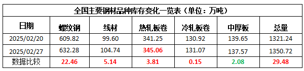 据西本资讯历史数据,当前库存总量较上年同期(2024年2月29日的1738.53万吨)减少387.81万吨,降幅为22.31%。分品种看,本期五大钢材品种库存中,除中厚板库存减少外,其它品种库存均有回升,但增幅较小。(见下图)