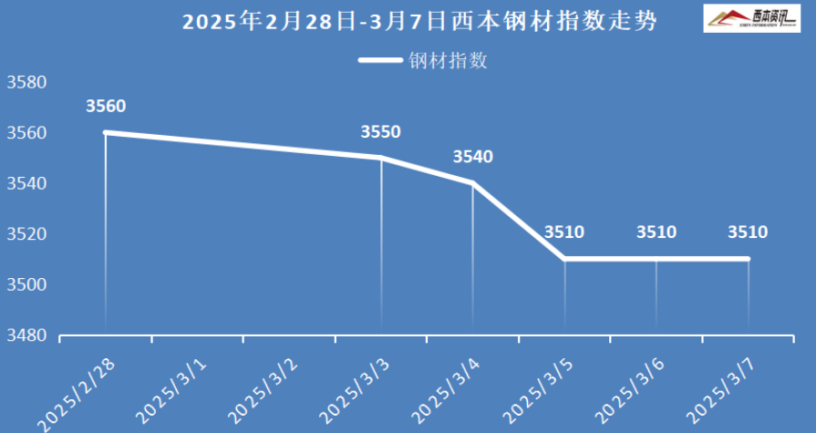 本周国内建筑钢材行情弱势下跌,截至3月7日,西本指数报在3510,周环比下跌50。