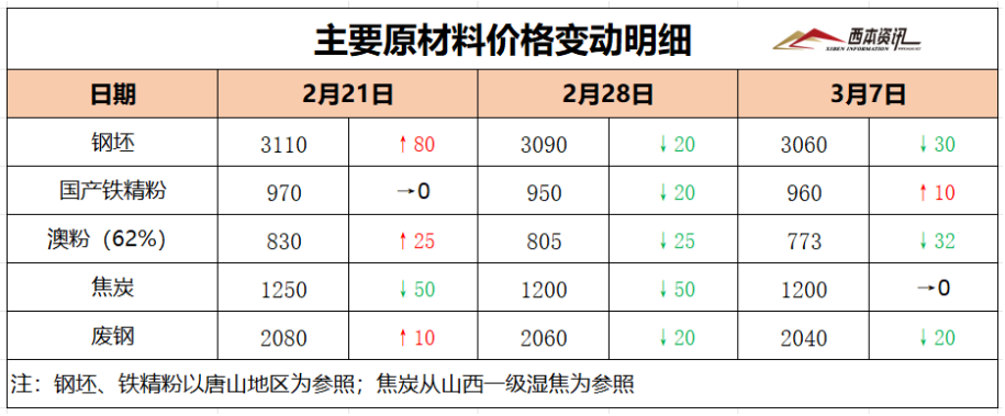 本周国内主要原料表现不一,其中,进口矿价弱势下行,钢坯行情震荡见跌,国产矿窄幅调整,焦炭十轮提降落地,废钢价格震荡偏弱,分品种来看: