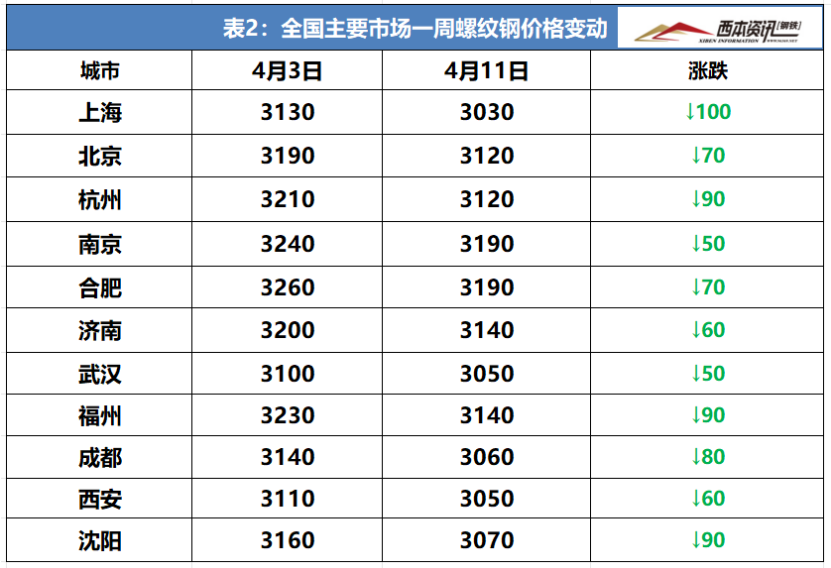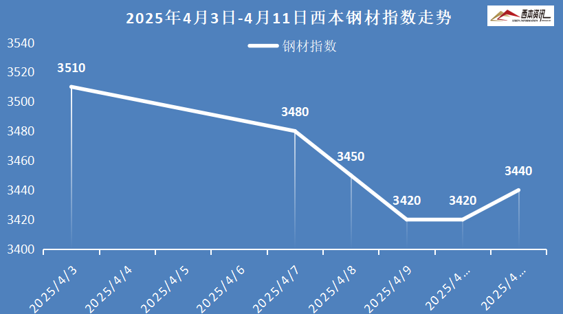 本周国内建筑钢材行情明显下跌,截至4月11日,西本指数报在3440,周环比下跌70。