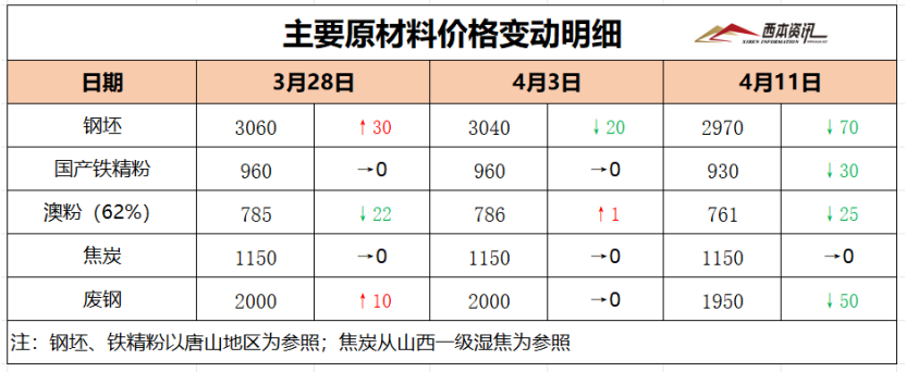 本周国内主要原料多数下跌,其中,进口矿价震荡见跌,钢坯行情跌幅明显,国产矿小幅下跌,焦炭价格维持平稳,废钢价格大幅回落,分品种来看: