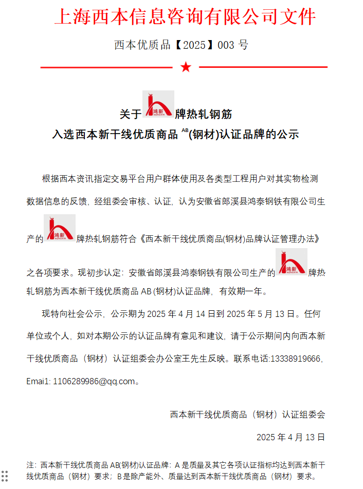 关于“鸿新”牌热轧钢筋入选西本新干线优质商品(钢材)认证品牌的公示