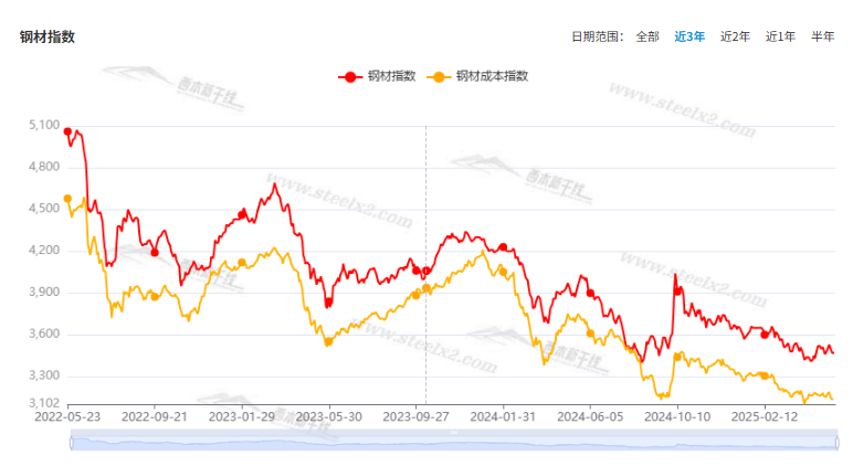 本期,全国各地市场建筑钢材价格环比回落:其中,北方钢厂托举,市场小跌;南方期货引导,波动回调。本周西本钢材指数下移,成本指数小跌,显示长流程钢厂利润空间变化不大;本周螺纹钢期货主力合约回归低位,对现货市场有抑制作用。(下图为红色线条为钢材指数,黄色线条为成本指数)
