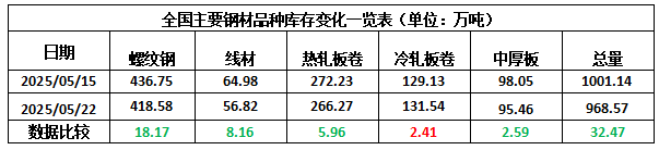 中钢协:2025年5月中旬,重点统计钢铁企业共生产粗钢2199万吨,平均日产219.9万吨,日产环比下降0.3%;生铁1982万吨,平均日产198.2万吨,日产环比下降0.4%;钢材2124万吨,平均日产212.4万吨,日产环比增长1.9%。5月中旬,重点统计钢铁企业钢材库存量1635万吨,环比上一旬增加29万吨,增长1.8%;比年初增加398万吨,增长32.2%;比上月同旬减少35万吨,下降2.1%;比去年同旬减少48万吨,下降2.9%,比前年同旬增加9万吨,增长0.6%。