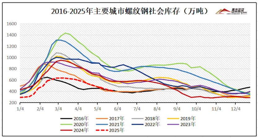 从钢厂库存来看,据中钢协数据显示,2025年5月中旬,重点统计钢铁企业钢材库存量 1635万吨,环比上一句增加29万吨,增长1.8%;比年初增加 398 万吨,增长32.2%;比上月同旬减少 35万吨,下降 2.1%;比去年同旬减少48万吨,下降2.9%,比前年同旬增加9万吨,增长0.6%。
