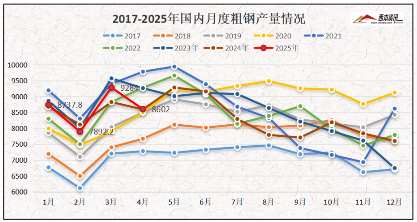 从钢厂生产情况来看,国家统计局数据显示,2025年4月份,中国粗钢产量8602万吨,同比持平;生铁产量7258万吨,同比增长0.7%;钢材产量12509万吨,同比增长6.6%。1-4月份,中国粗钢产量34535万吨,同比增长0.4%;生铁产量28885万吨,同比增长0.8%;钢材产量48021万吨,同比增长6.0%。