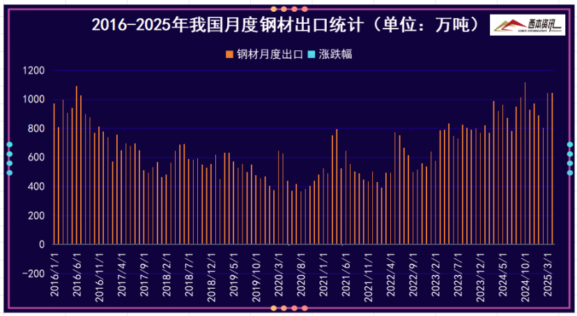 海关总署数据显示,2025年4月中国出口钢材1046.2万吨,较上月增加0.6万吨,环比增长0.1%;1-4月累计出口钢材3789.1万吨,同比增长8.2%。4月中国进口钢材52.2万吨,较上月增加2.1万吨,环比增长4.2%;1-4月累计进口钢材207.2万吨,同比下降13.9%。
