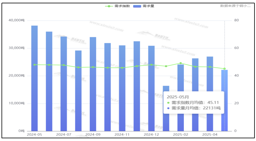 五一假期归来,央行既宣布降准降息,但降幅不及预期,期螺盘面继续弱势下行,市场操作谨慎,低价资源不断涌现,带动国内钢价震荡走低。同时,南方强降雨天气增多,采购需求有所减缓。即将进入6月份,南方将进入主汛期,北方高温南方降雨,步入传统需求淡季,届时,终端表需将进一步受到影响。据钢小二平台采样数据显示,5月份螺纹钢需求指数月环比下降6.63%。