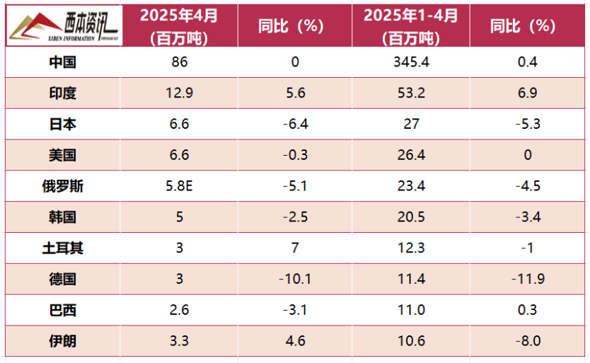 2025年4月,中国粗钢产量为8602万吨,同比持平;印度粗钢产量为1290万吨,同比提高5.6%;日本粗钢产量为660万吨,同比下降6.4%;美国粗钢产量为660万吨,同比下降0.3%;俄罗斯粗钢预估产量为580万吨,同比下降5.1%;韩国粗钢产量为500万吨,同比下降2.5%;土耳其粗钢产量为300万吨,同比提高7.0%;德国粗钢产量为300万吨,同比下降10.1%;巴西粗钢产量为260万吨,同比下降3.1%;伊朗粗钢产量为330万吨,同比提高4.6%。