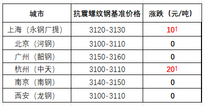 截至午间,国内部分市场螺纹钢(抗震)基价如下:上海市场3120-3130元/吨;北京市场3100-3110元/吨;广州市场3150-3160元/吨;杭州市场3100-3110元/吨;南京市场3150-3160元/吨;西安市场3100-3110元/吨。环比来看,截至上午收盘,全国主要市场价格稳中小涨。