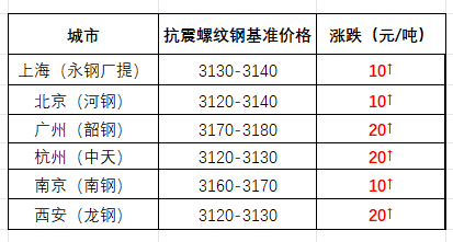 今日行情走势为低位调高,据西本跟踪统计的69个城市建材报价,开盘71%市场上涨,盘中变化不大;截至收盘,上海、杭州、南京等地主导资源价格回涨10-20元/吨。据上海市场反馈,今天库提小厂抗震螺纹钢基价高低区间在2970-2990元,厂提永钢螺纹钢基价区间在3100-3110元/吨。