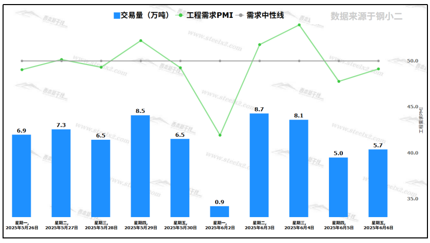 据钢小二平台样本数据,6月6日全国工程需求量为5.7万吨,环比上个交易日增加14%。工程需求pmi处于需求中心线下方,但日环比小幅上升2.7个百分点。