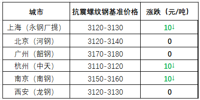 截至午间,国内部分市场螺纹钢(抗震)基价如下:上海市场3120-3130元/吨;北京市场3120-3140元/吨;广州市场3170-3180元/吨;杭州市场3110-3120元/吨;南京市场3150-3160元/吨;西安市场3120-3130元/吨。环比来看,截至上午收盘,全国主要市场价格稳中小跌。