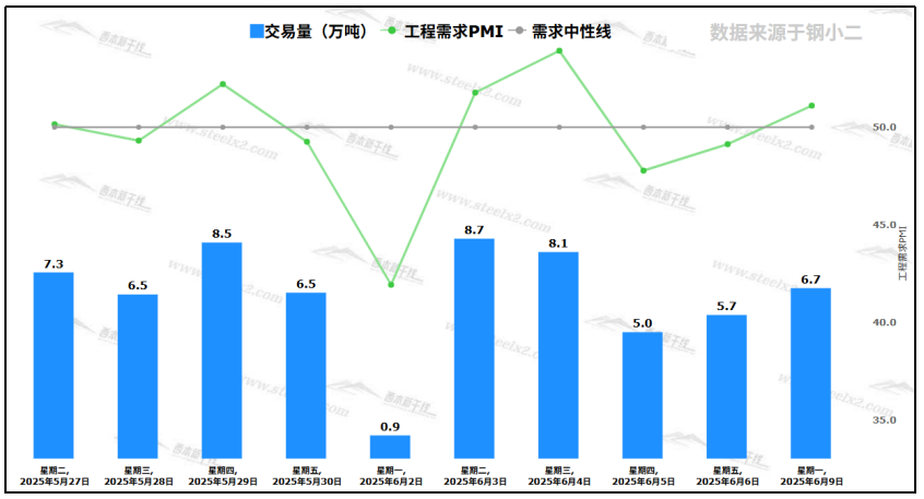据钢小二平台样本数据,6月9日全国工程需求量为6.7万吨,环比上个交易日增加17%。工程需求pmi升至需求中心线上方,日环比小幅上升2个百分点。