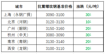 今日行情走势为盘中修复,据西本跟踪统计的69个城市建材报价,开盘93%市场下跌,午后多数走稳,局部调高;截至收盘,上海、杭州、南京等地主导资源价格波动20-30元/吨。据上海市场反馈,今天库提小厂抗震螺纹钢基价高低区间在2940-2970元,厂提永钢螺纹钢基价区间在3050-3070元/吨。